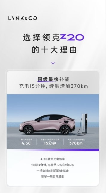 作为一款纯电SUV,领克Z20在性能上同样出类拔萃。它搭载了原生浩瀚纯电架构,配备了同级最大的后驱电机,零百加速仅需5.3秒。无论是穿梭于繁华的都市街道,还是驰骋在宽阔的高速公路上,都能轻松应对。而真闪充技术的加持,更让Z20在充电效率上大放异彩。仅需15分钟,便能从10%充至80%,续航增加370+公里,真正实现了极速补能,让驾驶者的每一次出行都更加无忧。